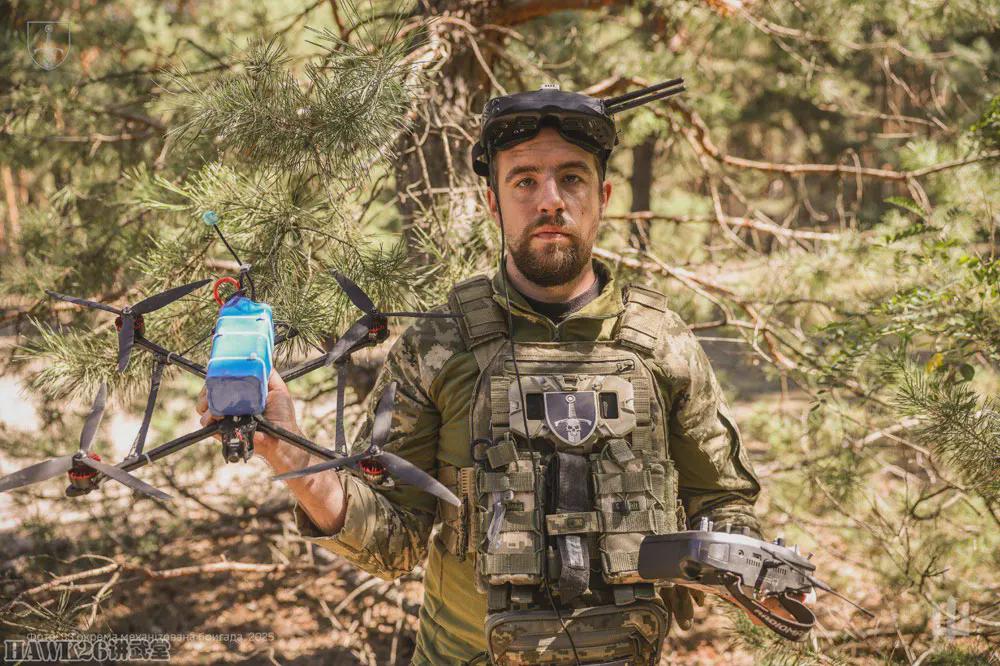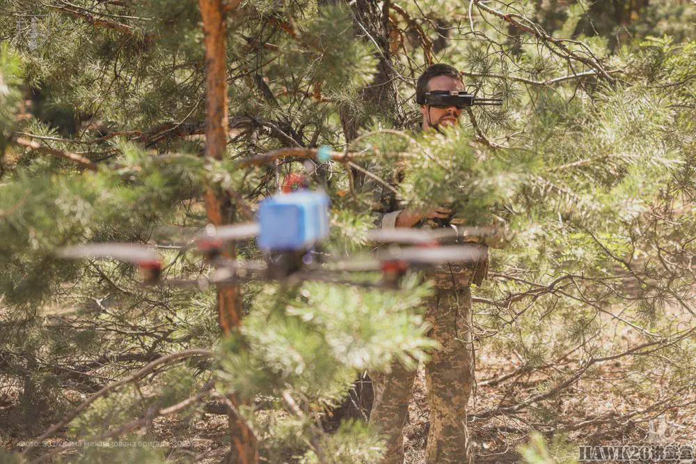 乌克兰士兵正在展示FPV无人机,他头上戴着VR眼镜可以更直观看到无人机摄像头拍摄的画面。