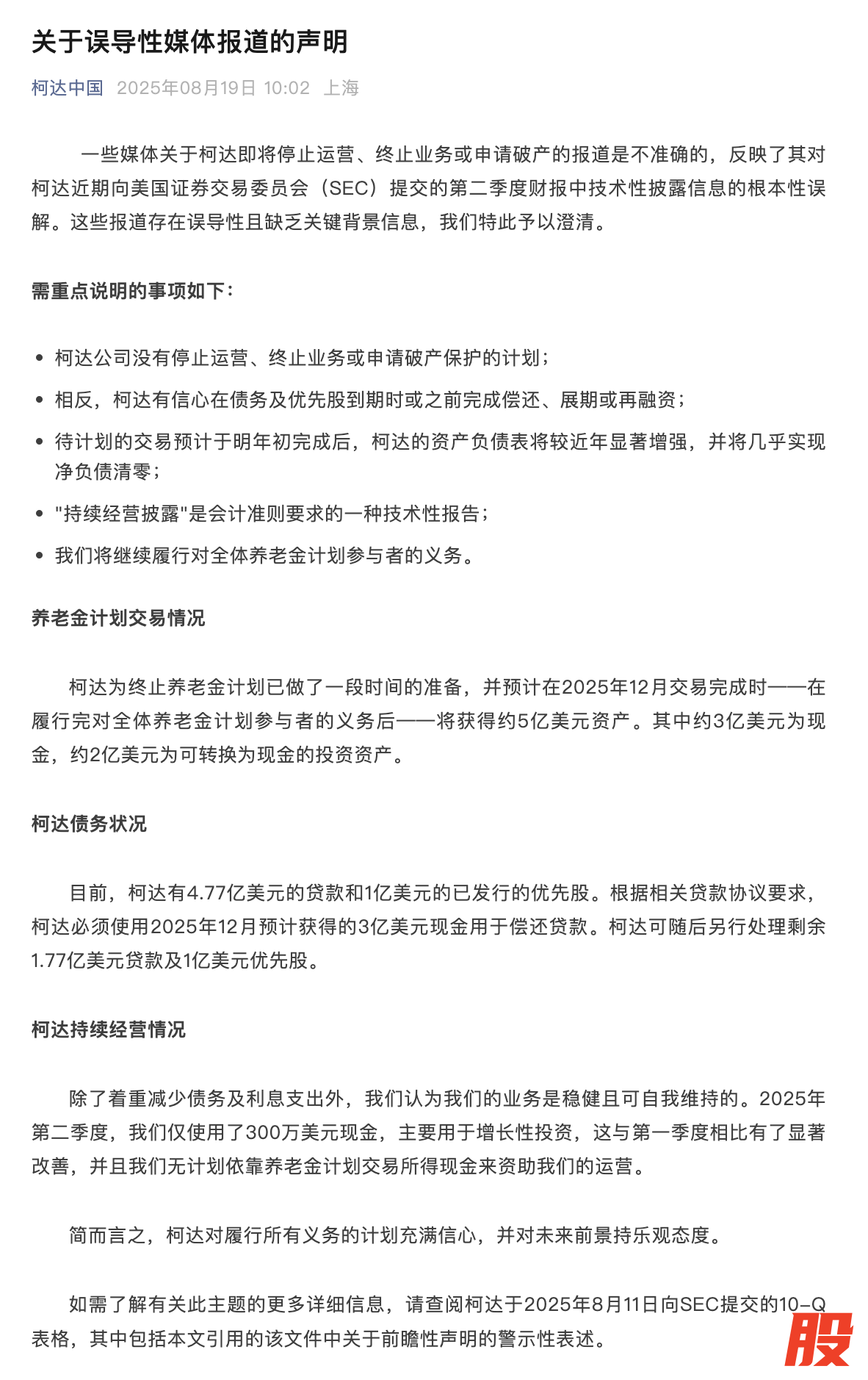柯达公司澄清:没有停止运营、终止业务或申请破产保护的计划柯达公司澄清:没有停止运营、终止业务或申请破产保护的计划
